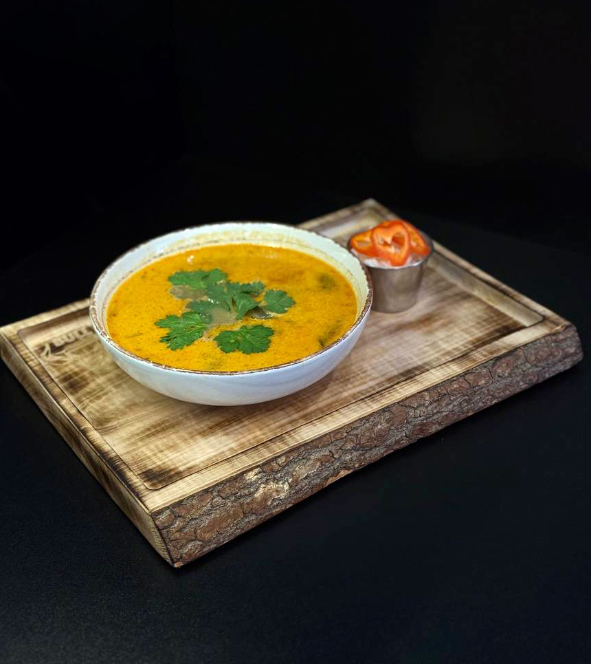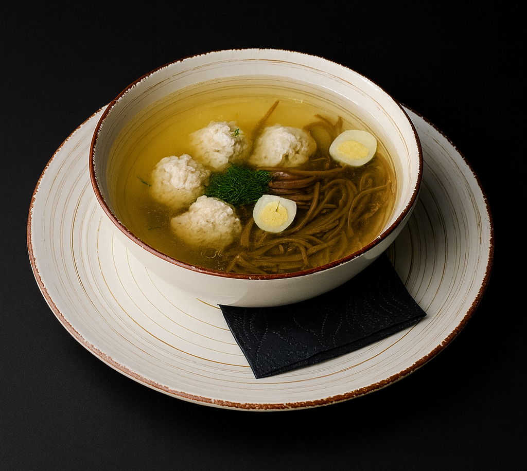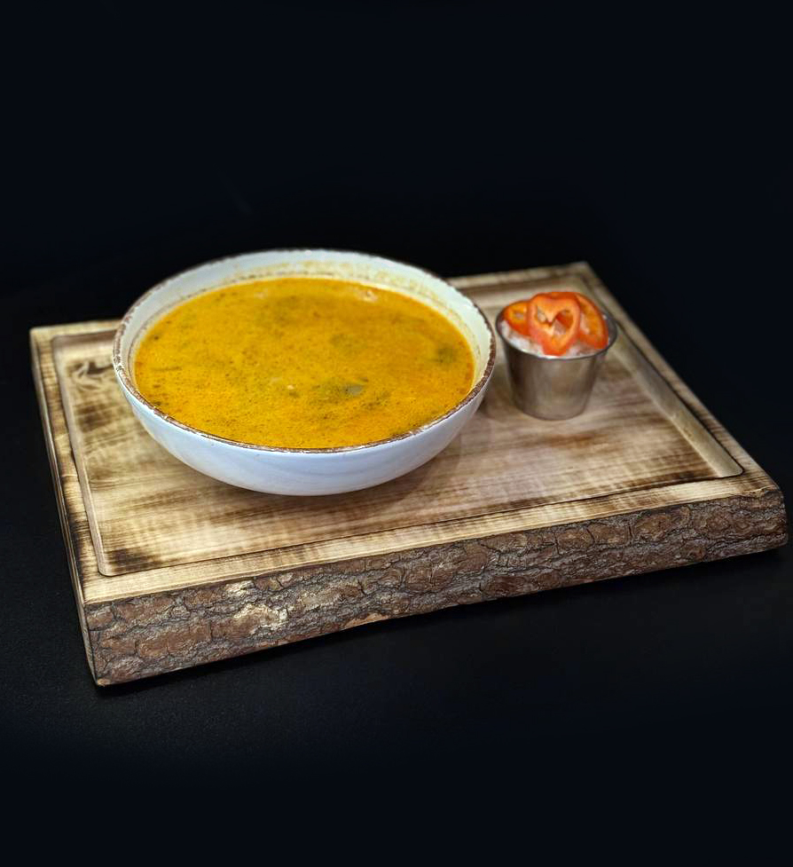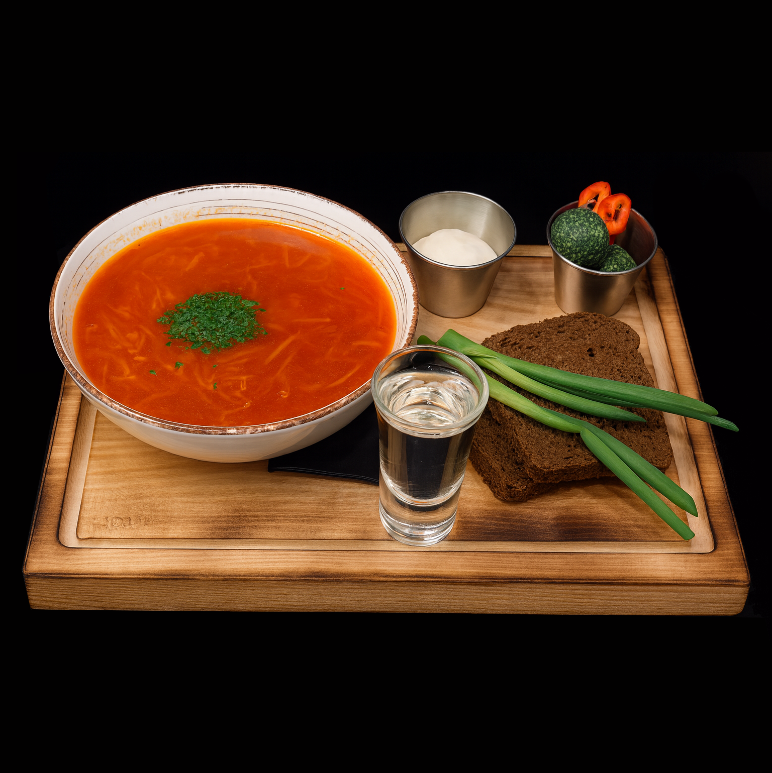 Борщ зі свиянчими реберцями, сметаною та салом рубленим