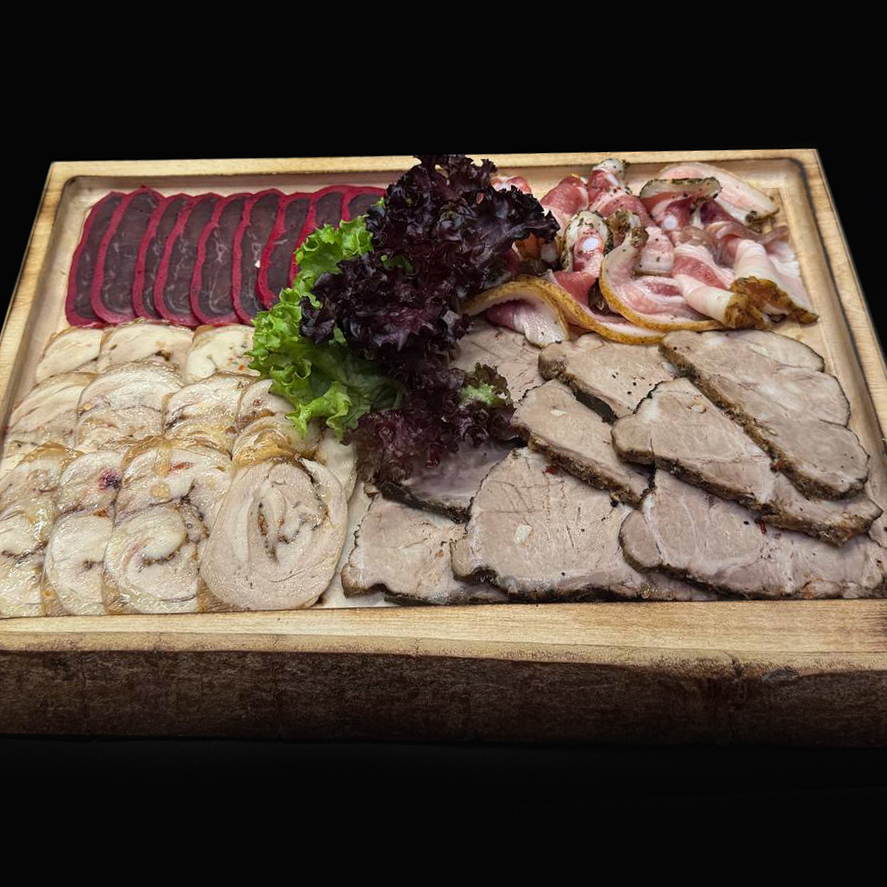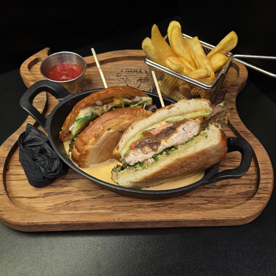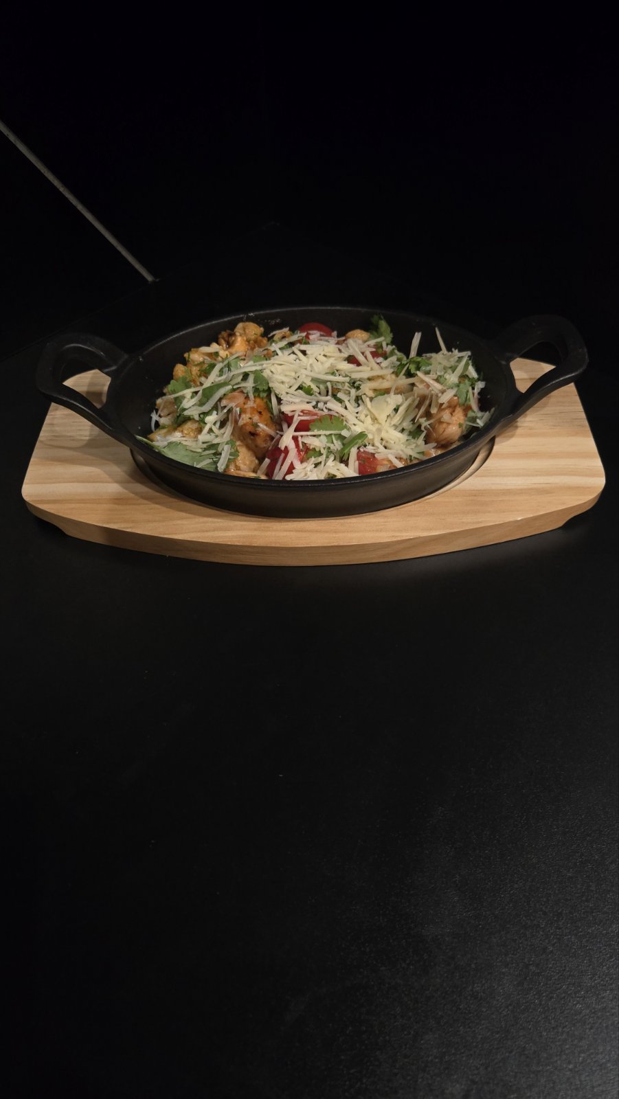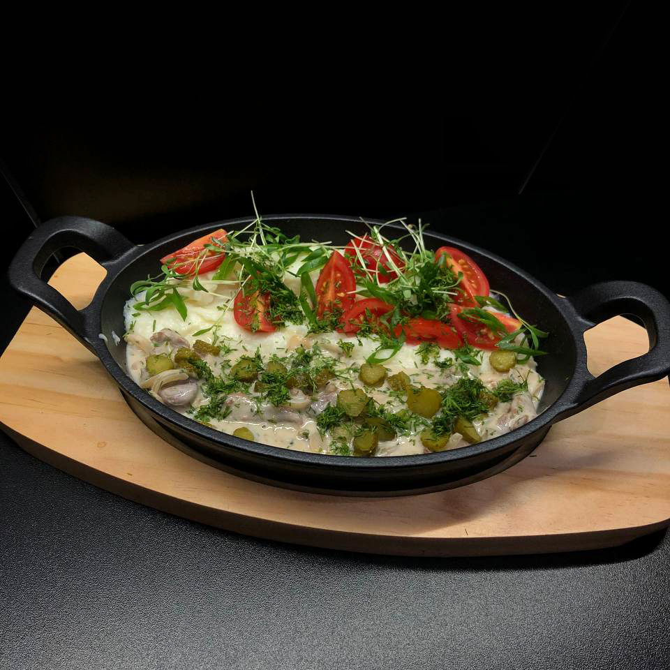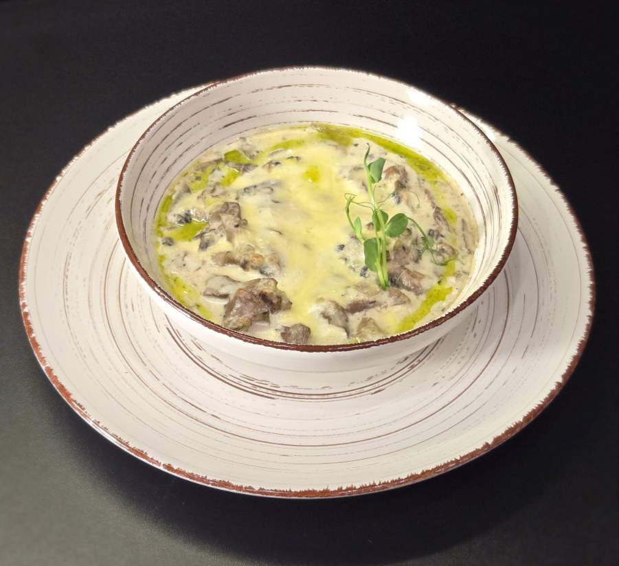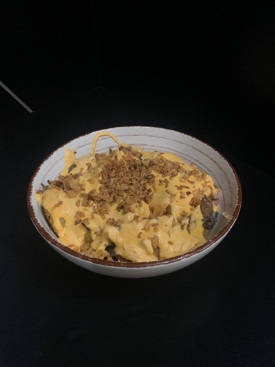 Картопля по селянськи с беконом та лісним міксом білих грибів з сирним соусом том-ям та кранчем